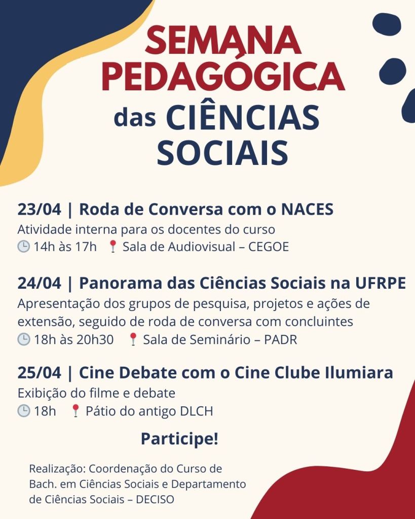 Nos dias 23, 24 e 25 de abril, vai rolar a Semana Pedagógica do Curso de Bacharelado em Ciências Sociais da UFRPE!